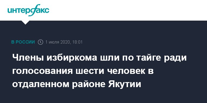 Москва. 1 июля. INTERFAX.RU - Члены территориальных и участковых комиссий Якутии преодолели большие расстояния в тайге и плыли по морю, чтобы жители региона могли проголосовать по поправкам в Конституцию РФ, говорится в распространенном пресс-службой комментарии главы республики Айсена Николаева.