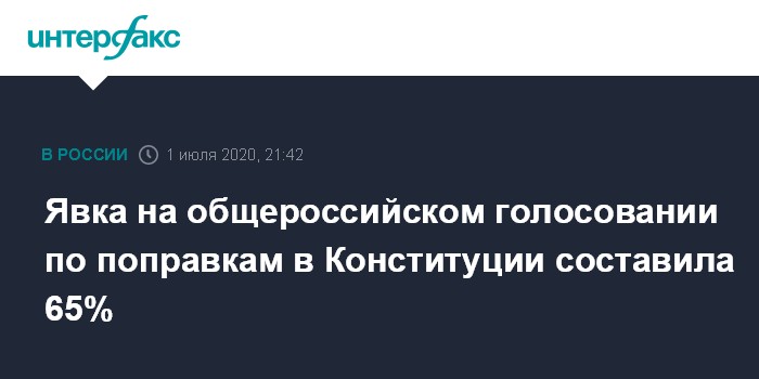 Москва. 1 июля. INTERFAX.RU - Согласно предварительным данным, явка на всероссийском голосовании по изменениям в Конституцию РФ составила 65%, заявила председатель Центральной избирательной комиссии Элла Памфилова.