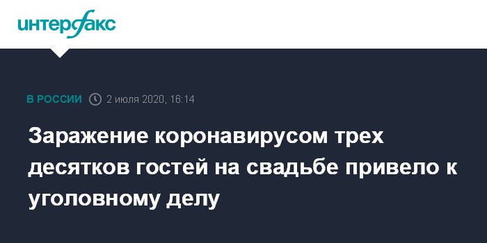 Москва. 2 июля. INTERFAX.RU - В Свердловской области возбуждено уголовное дело о заражении 28 человек коронавирусом на свадьбе, сообщила пресс-служба Генпрокуратуры. Дело расследуется по ч.2 ст.236 УК (нарушение санитарно-эпидемиологических правил, повлекшее по неосторожности смерть человека).