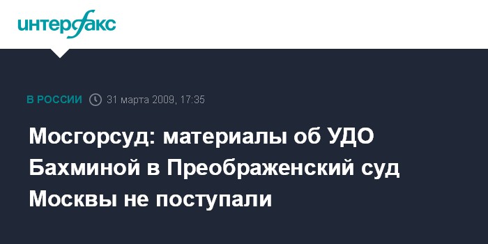 Москва. 31 марта. INTERFAX.RU - В Преображенский суд Москвы не поступали материалы об условно досрочном освобождении бывшего юриста НК "ЮКОСа", ранее осужденной Светланы Бахминой. "Производству Преображенского районного суда материалы в отношении Светланы Бахминой не поступали", - сообщила "Интерфаксу" руководитель пресс-службы Мосгорсуда Анна Усачева.