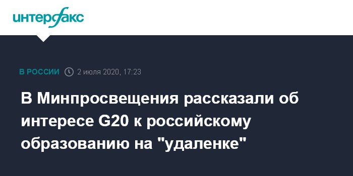 Москва. 2 июля. INTERFAX.RU - Министры образования стран "Группы 20" заинтересовались опытом России по организации дистанционного образования в период, когда из-за коронавируса очная учеба стала невозможной. Об этом "Интерфаксу" сообщили в пресс-службе Минпросвещения России.