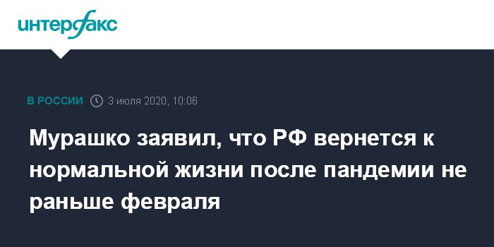 Москва. 3 июля. INTERFAX.RU - Министр здравоохранения России Михаил Мурашко считает, что возвращение к полноценной жизни в РФ до февраля следующего года маловероятно.