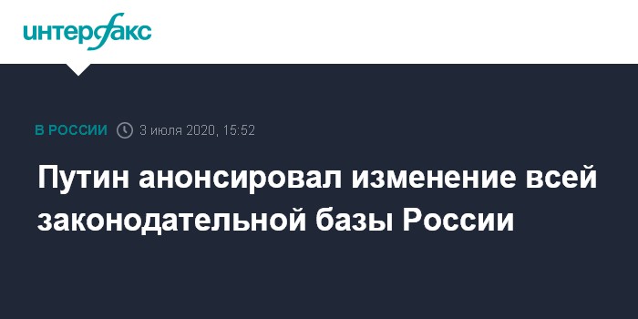 Москва. 3 июля. INTERFAX.RU - России предстоит качественное изменение законодательства после принятия поправок к Конституции, сообщил президент РФ Владимир Путин.