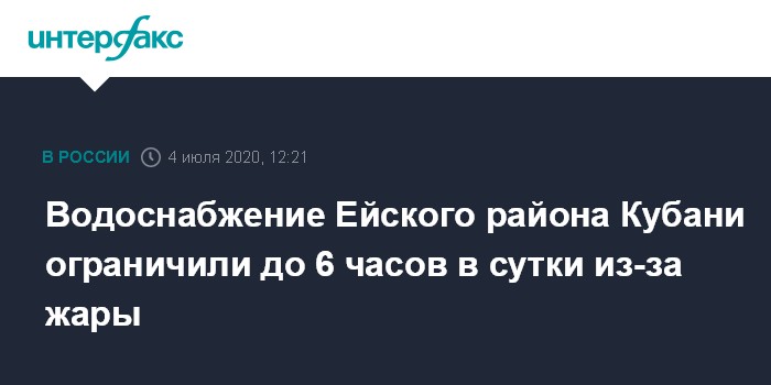 Москва. 4 июля. INTERFAX.RU - Жесткий график подачи воды ввели в Ейском районе Краснодарского края из-за сильной жары, сообщила в субботу компания "Кубаньводкомплекс".