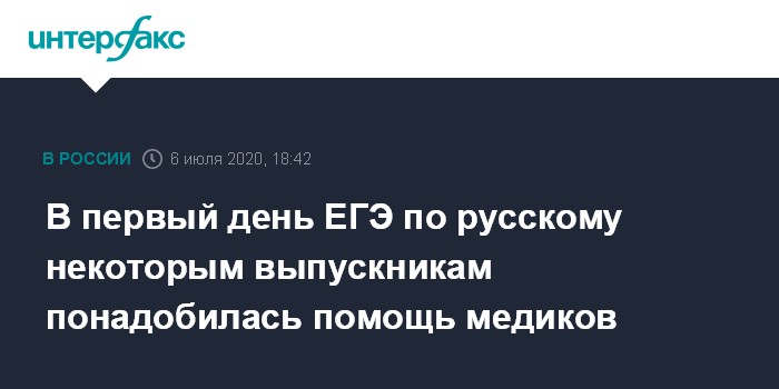 Москва. 6 июля. INTERFAX.RU - Первый день проведения самого массового ЕГЭ по русскому языку завершился без сбоев в штатном режиме, из-за жары некоторым выпускникам понадобилась медпомощь, сообщает пресс-служба Рособрнадзора.