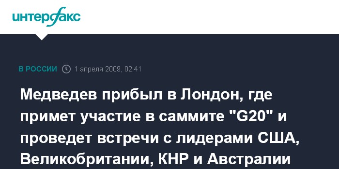Медведев прибыл в Лондон, где примет участие в саммите "G20" и проведет встречи с лидерами США, Великобритании, КНР и Австралии