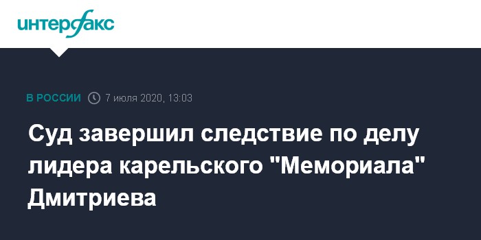 Москва. 7 июля. INTERFAX.RU - Завершено судебное следствие по делу главы карельского отделения "Мемориала" Юрия Дмитриева, обвиняемого в сексуальном насилии над приемной дочерью. Об этом сообщили "Интерфаксу" в Петрозаводском городском суде во вторник.