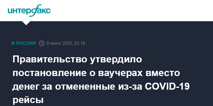Москва. 8 июля. INTERFAX.RU - Правительство РФ утвердило постановление, которое узаконивает право авиакомпаний выдавать пассажирам ваучеры вместо денег за отмененные в связи с COVID-19 рейсы.