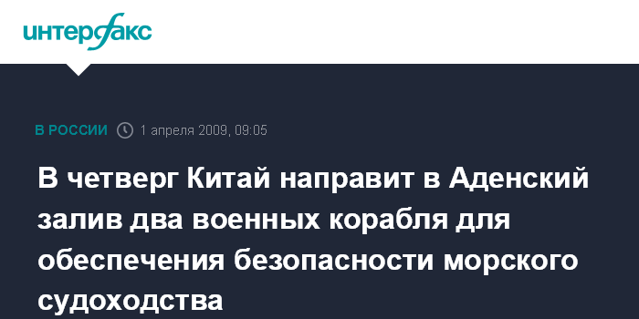 В четверг Китай направит в Аденский залив два военных корабля для обеспечения безопасности морского судоходства