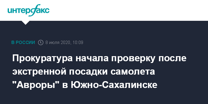 Москва. 8 июля. INTERFAX.RU - Сахалинская транспортная прокуратура проводит проверку по факту экстренной посадки в среду утром в аэропорту Южно-Сахалинска самолета авиакомпании "Аврора", выполнявшего рейс из Владивостока в Петропавловск-Камчатский, сообщает пресс-служба Дальневосточной транспортной прокуратуры (ДВТП).