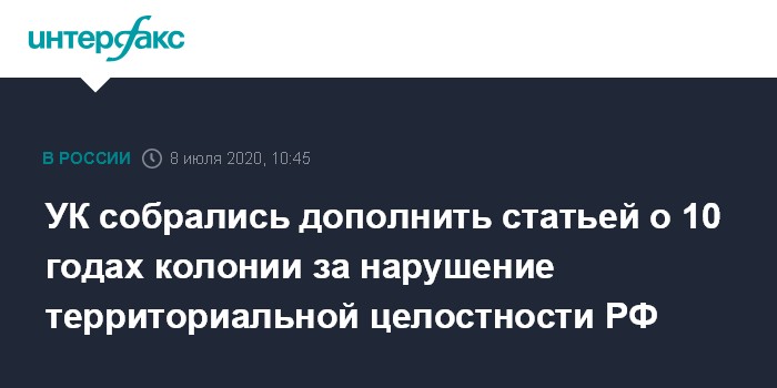 "Поскольку в Конституции закреплен прямой запрет на отчуждение части территории Российской Федерации, либо на осуществление иных действий, направленных на нарушение территориальной целостности, предлагается дополнить Уголовный кодекс новой статьей 280.2 "Нарушение территориальной целостности Российской Федерации", - сказал Крашенинников журналистам в среду.