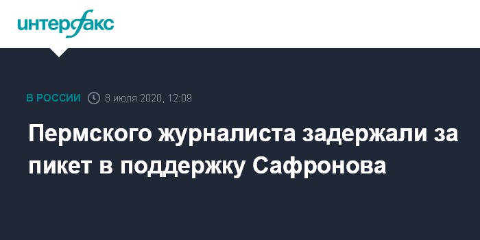 Москва. 8 июля. INTERFAX.RU - В Перми журналист медиа-проекта "Четвертый сектор" Михаил Данилович написал в соцсети, что его задержали после участия в одиночном пикете в поддержку Ивана Сафронова у здания управления ФСБ по Пермскому краю.