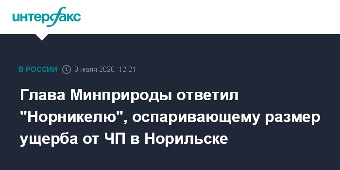 Москва. 8 июля. INTERFAX.RU - Ущерб окружающей среде и ликвидация последствий аварии - два несопоставимых понятия. Такую позицию главы Минприроды Дмитрия Кобылкина распространила пресс-служба ведомства в ответ на сообщение "Норникеля", который оспаривает размер вреда окружающей среде от ЧП в Норильске, рассчитанный Росприроднадзором.