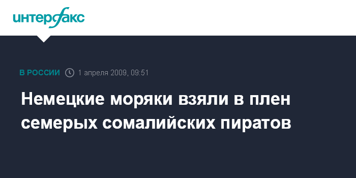 Москва. 1 апреля. INTERFAX.RU - Семь человек, подозреваемых в пиратстве, были взяты в плен военными моряками ФРГ после того, как бандиты обстреляли немецкий танкер в Аденском заливе, сообщил во вторник американский телеканал Си-эн-эн со ссылкой на заявление немецкого военного командования.