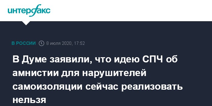Москва. 8 июля. INTERFAX.RU - Проведение предложенной Советом при президенте РФ по правам человека (СПЧ) амнистии по административным штрафам за нарушение режима самоизоляции сейчас невозможно, необходимо принятие специального закона, заявил первый зампред комитета Госдумы по государственному строительству и законодательству Михаил Емельянов.