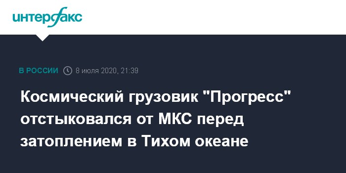 Москва. 8 июля. INTERFAX.RU - Транспортный грузовой корабль "Прогресс МС-13" расстыковался с Международной космической станцией (МКС) для последующего затопления в Тихом океане.