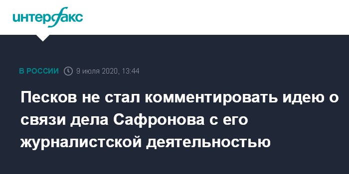 Москва. 9 июля. INTERFAX.RU - В Кремле не знают, откуда появились предположения о том, что дело о госизмене, возбужденное в отношении советника главы "Роскосмоса" Ивана Сафронова, может быть связано с его журналистской деятельностью.