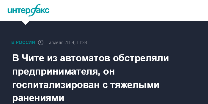 Москва. 1 апреля. INTERFAX.RU - Возле центрального рынка Читы неизвестный, находившийся в автомобиле, тяжело ранил четырьмя выстрелами в спину предпринимателя из приграничного поселка Забайкальск.