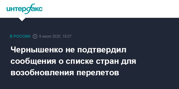 "У меня такой информации нет. Я ее ни подтвердить, ни опровергнуть не могу", - заявил Чернышенко, комментируя информацию в СМИ о том, что Роспотребнадзор предложил на первом этапе возобновить авиасообщение с девятью странами Европы и Китаем.