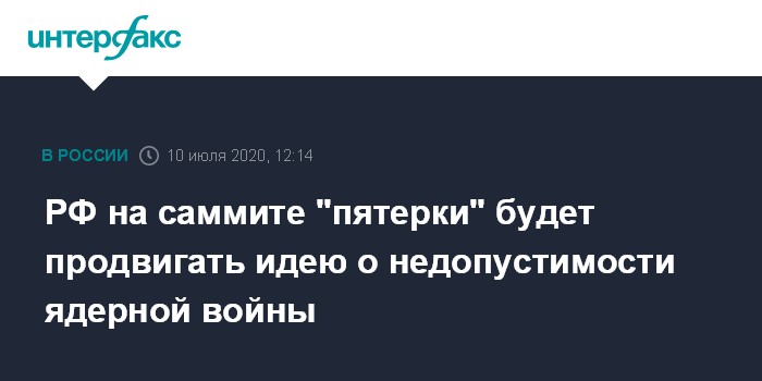Москва. 10 июля. INTERFAX.RU - Россия на саммите "пятерки" постоянных членов Совета безопасности ООН намерена продвигать идею о недопустимости ядерной войны, заявил глава МИД РФ Сергей Лавров.