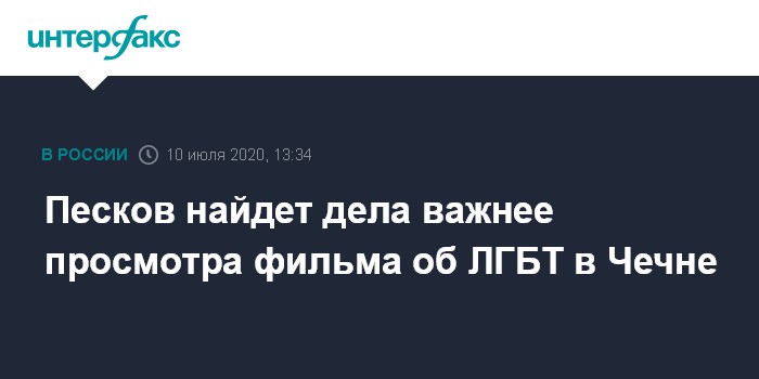 Москва. 10 июля. INTERFAX.RU - В Кремле не намерены смотреть документальный фильм Дэвида Франса "Добро пожаловать в Чечню" о ситуации с ЛГБТ-меньшинствами в республике, у чиновников есть более важные дела, заявил на брифинге пресс-секретарь президента Дмитрий Песков.