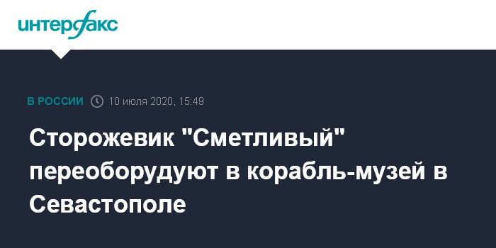 Москва. 10 июля. INTERFAX.RU - Сторожевой корабль "Сметливый" будет отремонтирован в ближайшее время, его планируют перепрофилировать в корабль-музей. Об этом сообщила пресс-служба ФГУП "13-й судоремонтный завод Черноморского флота" Минобороны РФ (Севастополь), которое займется доковым ремонтом судна.