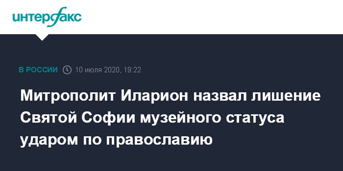 "Мы с большим сожалением, с большой болью воспринимаем то, что это решение сегодня было принято. Это удар по всему мировому православию, потому что для всех православных христиан по всему миру храм Святой Софии - это такой же символ, как для католиков храм Святого Петра в Риме", - сказал митрополит в пятницу в эфире телеканала "Россия-24" (ВГТРК).