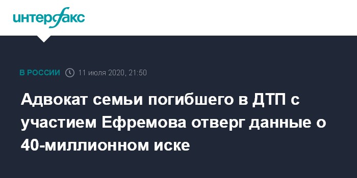 Москва. 11 июля. INTERFAX.RU - Защитник семьи Сергея Захарова, погибшего в ДТП с участием Михаила Ефремова, опроверг информацию о заявленных гражданских исках в размере 40 млн рублей к актеру.