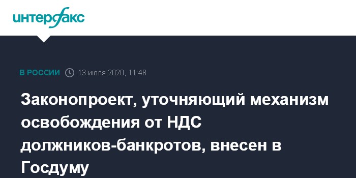 Москва. 13 июля. INTERFAX.RU - Правительство РФ внесло в Госдуму законопроект, который уточняет, что от НДС освобождается не только продажа имущества и имущественных прав должников, признанных банкротами, но и продажа товаров, работ, услуг и имущественных прав после признания их банкротами.