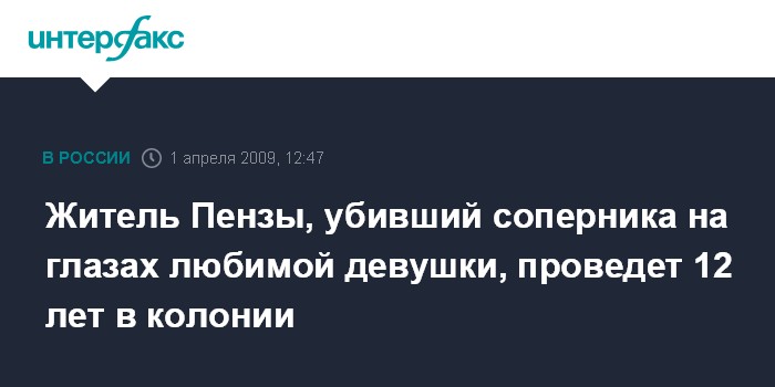 Москва. 1 апреля. INTERFAX.RU - Октябрьский районный суд Пензы вынес приговор жителю Пензы, обвиняемому в убийстве соперника из ревности.