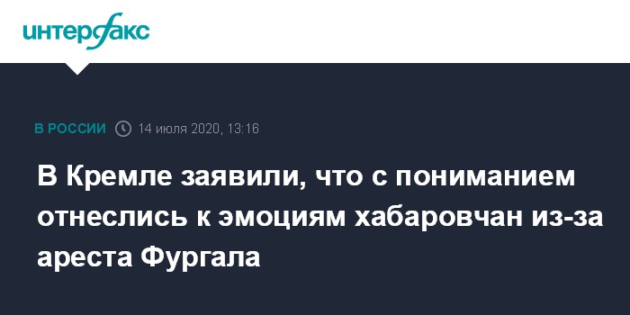 Москва. 14 июля. INTERFAX.RU - В Кремле заявили, что с пониманием относятся к эмоциональным выступлениям жителей Хабаровского края в связи с задержанием губернатора Сергея Фургала, отметили серьезный характер предъявленных ему обвинений и призвали хабаровчан набраться терпения.