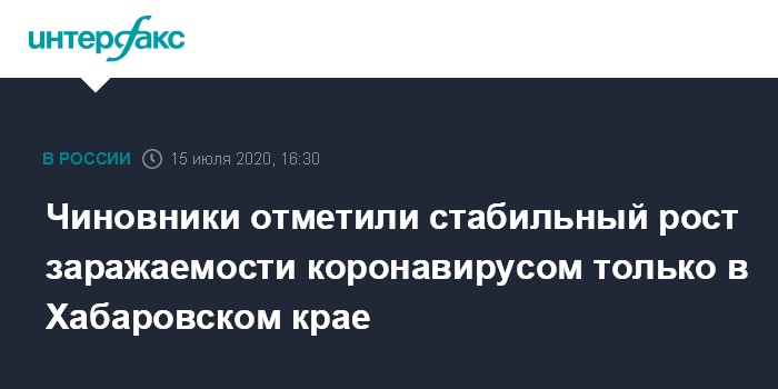 Москва. 15 июля. INTERFAX.RU - По данным федерального оперативного штаба по борьбе с коронавирусом, Хабаровский регион - единственный в России, где последние десять недель увеличивается заболеваемость. Об этом сообщил информцентр штаба.