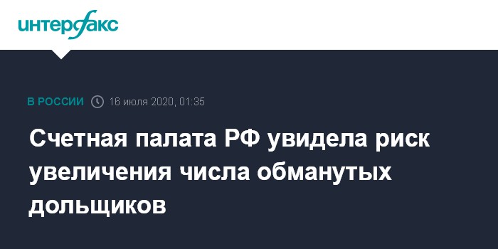 Москва. 16 июля. INTERFAX.RU - Счетная палата (СП) РФ видит риски увеличения количества долгостроев и обманутых дольщиков в стране на фоне участившихся случаев банкротств застройщиков, сообщили в четверг в пресс-службе ведомства.