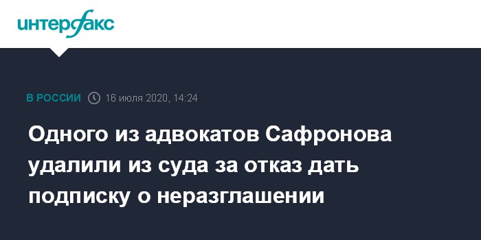 Москва. 16 июля. INTERFAX.RU - Одного из защитников советника главы "Роскосмоса" Ивана Сафронова удалили с судебного процесса в Мосгорсуде из-за его отказа дать подписку о неразглашении государственной тайны.