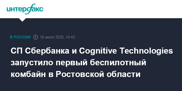 СП Сбербанка и Cognitive Technologies запустило первый беспилотный комбайн в Ростовской области
