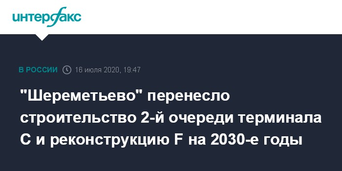 Москва. 16 июля. INTERFAX.RU - АО "Международный аэропорт "Шереметьево" (МАШ) перенесло строительство второй очереди терминала C и реконструкцию терминала F на 2030-е годы, следует из годового отчета компании.