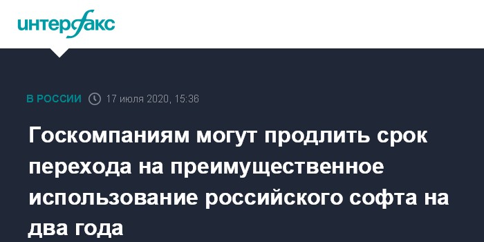 Москва. 17 июля. INTERFAX.RU - Крупнейшим госкомпаниям могут продлить до 2023 год срок перехода на преимущественное использование российского программного обеспечения, сообщил "Интерфаксу" информированный источник. Раньше предполагалось, что переход должен завершиться до 2021 года.