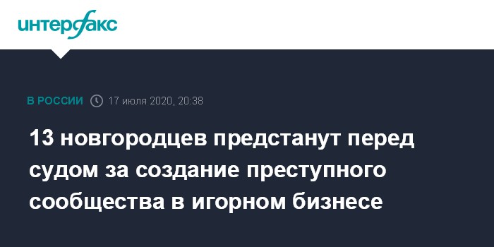 Москва. 17 июля. INTERFAX.RU - 13 жителей Новгородской области предстанут перед судом за создание преступного сообщества в игорном бизнесе. Об этом сообщает в пятницу пресс-служба региональной прокуратуры.