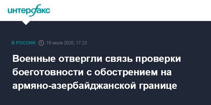 Москва. 18 июля. INTERFAX.RU - Внезапная проверка боевой готовности, которая началась в Вооружённых силах РФ в минувшую пятницу, никак не связана с обострением обстановки на армяно-азербайджанской границе, заявил замминистра обороны РФ Александр Фомин журналистам.
