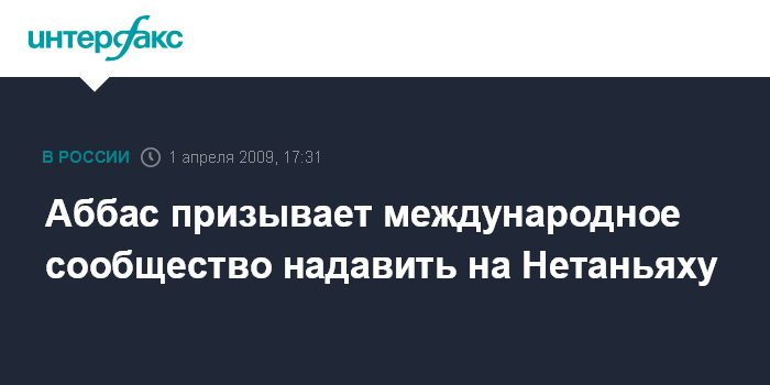 Москва. 1 апреля. INTERFAX.RU - Председатель Палестинской национальной администрации Махмуд Аббас призвал международное сообщество оказывать давление на нового премьер-министра Израиля, Биньямина Нетаньяху до тех пор, пока он не одобрит создание двух государств - еврейского и палестинского, сообщило в среду агентство ЭФЭ.