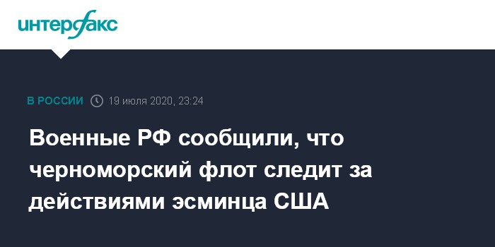 Москва. 19 июля. INTERFAX.RU - Черноморский флот следит за действиями эсминца ВМС США, зашедшего в акваторию Черного моря, сообщили в воскресенье в Национальном центре управления обороной Российской Федерации.