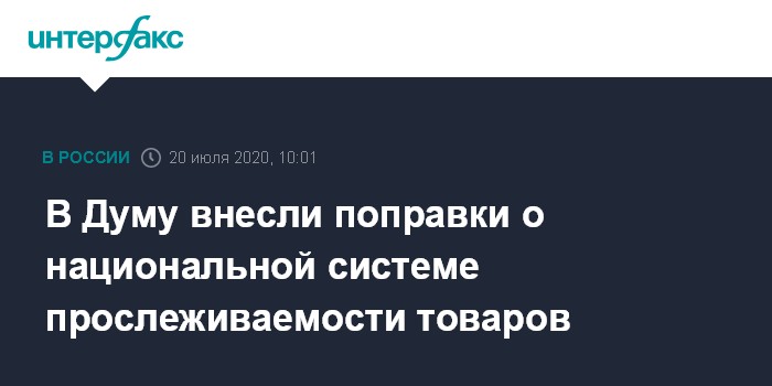 Москва. 20 июля. INTERFAX.RU - Правительство внесло в Госдуму поправки в Налоговый кодекс о создании с 1 января 2021 года обязательной национальной системы прослеживаемости товаров (НСП). Сейчас она работает в рамках эксперимента.