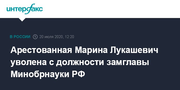6 июля Тверской суд Москвы по ходатайству следствия отправил под арест статс-секретаря - заместителя министра науки и высшего образования Лукашевич, задержанную по делу о хищении бюджетных средств. Ей вменяется особо крупное мошенничество (ч. 4 ст. 159 УК РФ). Свою вину бывшая чиновница не признает.