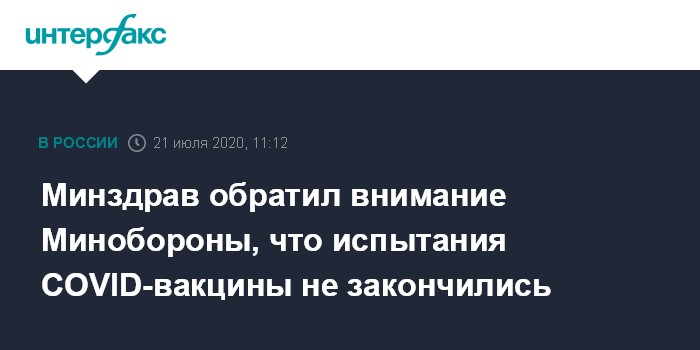 Минздрав обратил внимание Минобороны, что испытания COVID-вакцины не закончились
