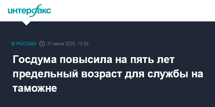 Москва. 21 июля. INTERFAX.RU - Госдума приняла в третьем чтении законопроект № 977181-7 об увеличении на пять лет предельного возраста службы в таможенных органах. Изменения затронут среднее, старшее и высшее начальство.