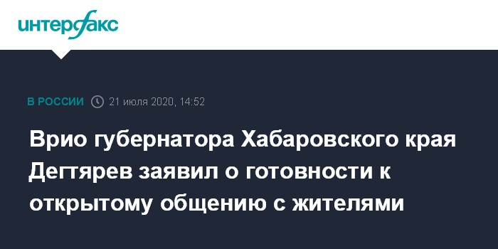 Москва. 21 июля. INTERFAX.RU - Временно исполняющий обязанности губернатора Хабаровского края Михаил Дегтярев, приступивший к работе в Хабаровске во вторник, заявил, что открыт к общению с жителями региона.