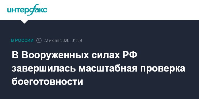Москва. 22 июля. INTERFAX.RU - В Вооруженных силах России завершены мероприятия внезапной проверки боевой готовности, проводившейся в период с 17 по 21 июля в соответствии с решением верховного главнокомандующего, сообщает Минобороны РФ.