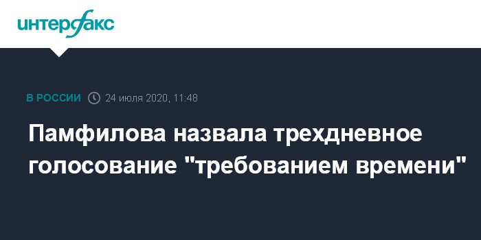 Москва. 24 июля. INTERFAX.RU - ЦИК России предлагает провести выборы в сентябре в течение трех дней, включая два дня досрочного голосования, которое было применено на общероссийском голосовании по поправкам к Конституции, сообщила председатель Центризбиркома Элла Памфилова.