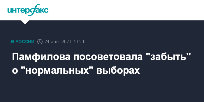 Москва. 24 июля. INTERFAX.RU - Председатель Центризбиркома Элла Памфилова считает, что условия для проведения выборов надолго изменились, а о прежних, нормальных, нужно забыть. Ранее в этот день она предложила провести по новым правилам уже ближайшие выборы, намеченные на сентябрь, и назвала это "требованием времени", а не "прихотью".