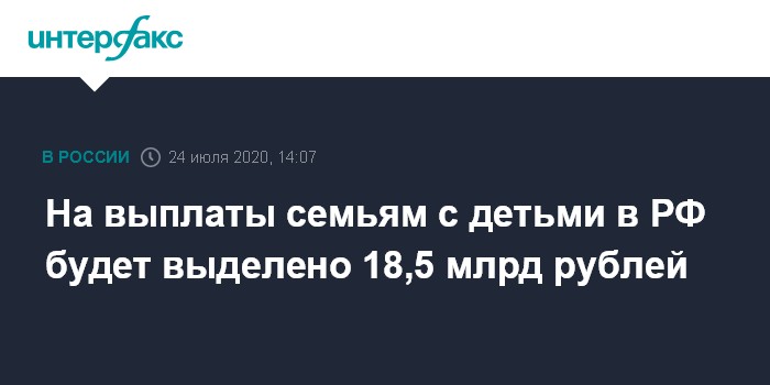 Москва. 24 июля. INTERFAX.RU - Правительство РФ выделит дополнительно 18,5 млрд рублей на ежемесячные выплаты нуждающимся семьям с детьми от трех до семи лет, сообщил премьер Михаил Мишустин.